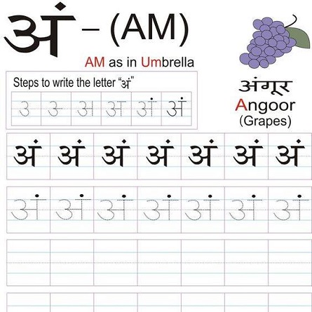 Lets PracticeRandom Ang An Am admin May 29, 2018June 1, 2018 Let’s practice writing the Hindi letter ‘अं’ (ang, an,am) as in अंगूर (angūr; grapes).