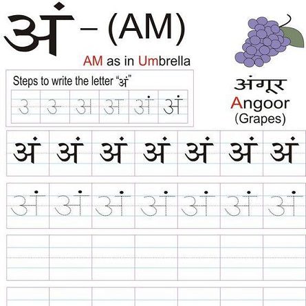 Lets PracticeRandom admin May 29, 2018June 1, 2018 Ang An Am Let’s practice writing the Hindi letter ‘अं’ (ang, an,am) as in अंगूर (angūr; grapes). Read More